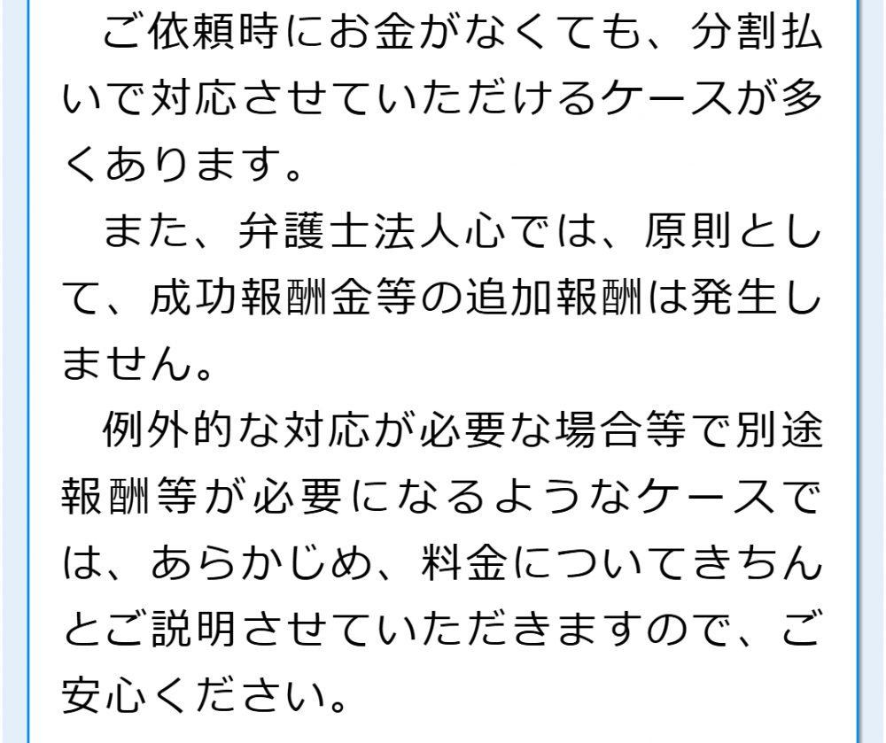 ご相談時の費用が心配な方もいらっしゃるかと思います。当法人は原則相談料を無料しておりますので、こちらに記載のあるフリーダイヤル等からお気軽にお問い合わせください。