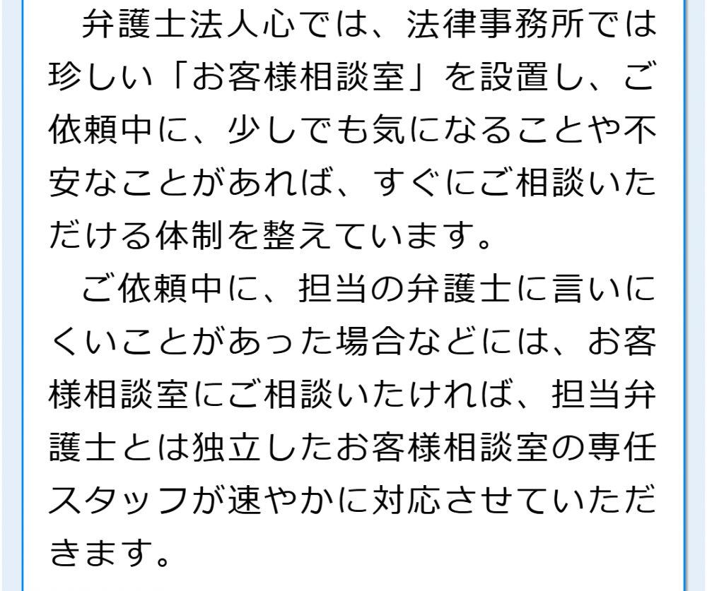 手続きの結果だけでなく、お気持ちの面でもご満足いただくことができるよう、弁護士とともにスタッフも丁寧にサポートさせていただきます。こちらで所属スタッフをご紹介しています。